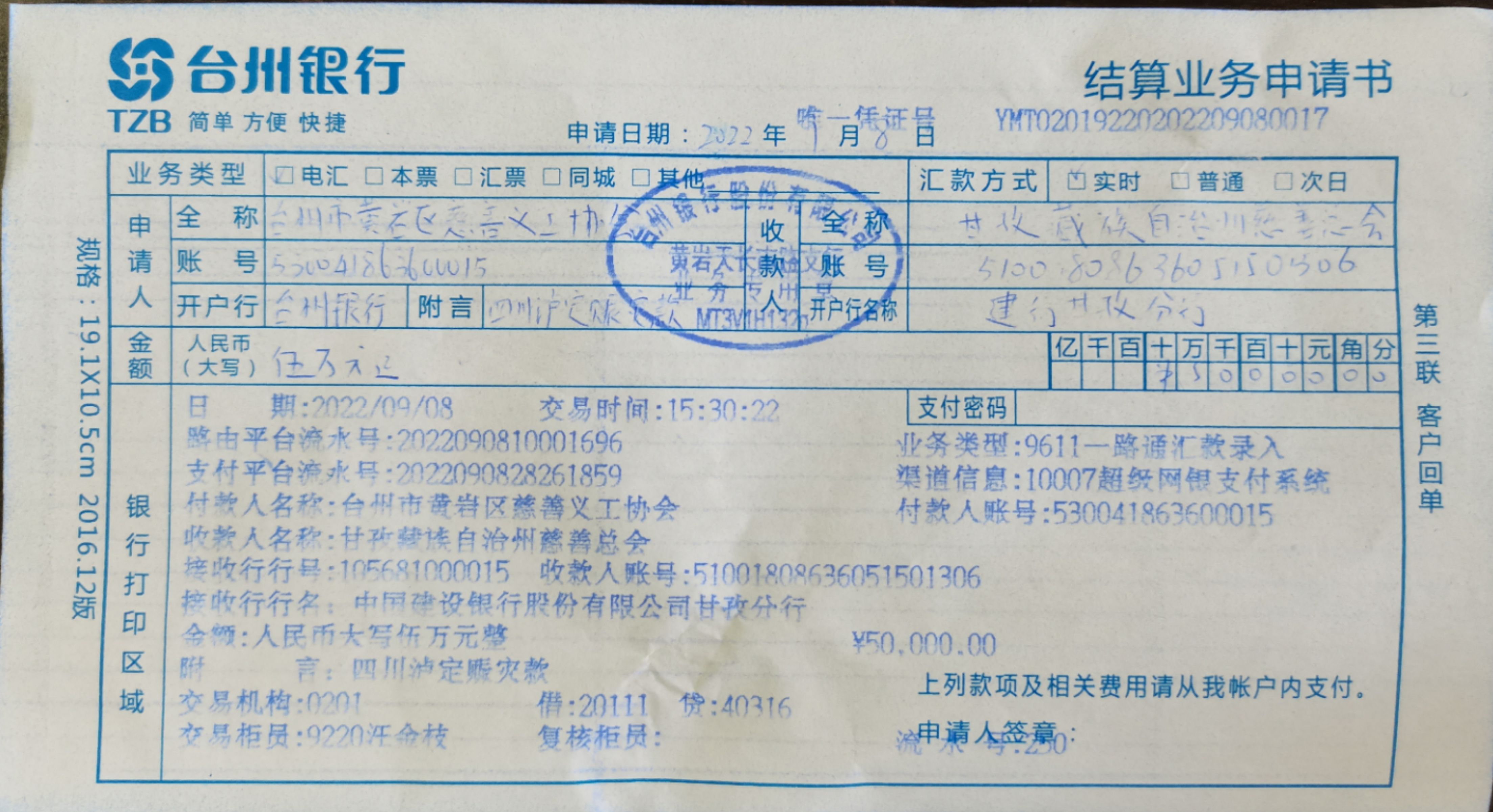 8日下午3点半左右,黄岩区慈善义工协会出纳喻洁来到台州银行黄岩支行,将5万元爱心款汇进了四川甘孜州慈善总会指定的赈灾收款账户。黄岩区慈善义工协会党支部书记徐凤华说,四川甘孜州泸定县发生地震后,他们一直在关注并跟进事件进展,同时紧急组织协会党支部和理事会成员讨论协商,希望能为地震灾区群众做点什么:“四川这次地震发生以后,我们大家都关注着这件事情,也都很着急,我们党支部还有理事会也紧急地商量能做点什么。”