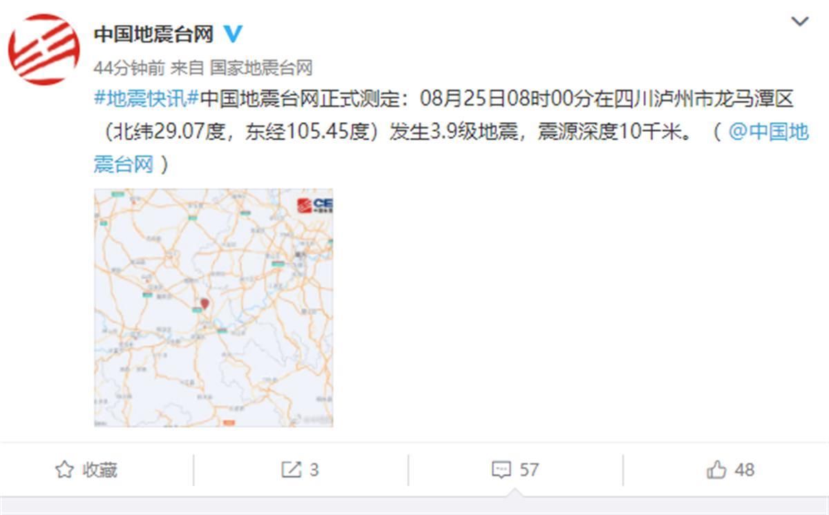 8月25日,中国地震台网正式测定当日上午8时,在四川泸州市龙马潭区(北纬29.07度,东经105.45度)发生3.9级地震,震源深度10千米。震中距成都市214公里,距重庆市120公里。